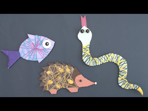 Animaux en carton customisés avec de la peinture et des fils de couleurs