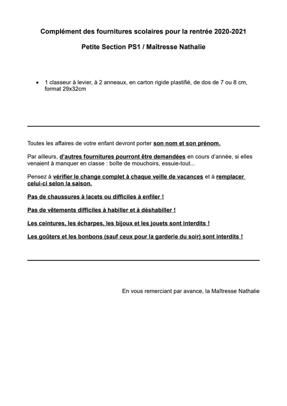 Complément des fournitures scolaires pour la classe de Nathalie - PS1