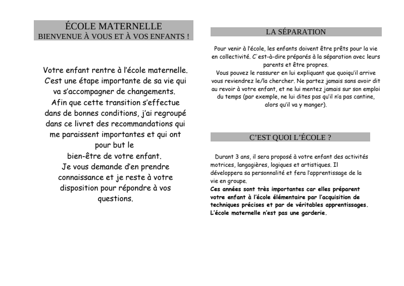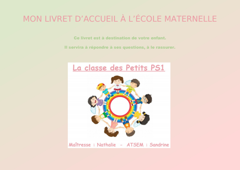 Le livret d'accueil des élèves de PETITES Sections chez la Maîtresse Nathalie